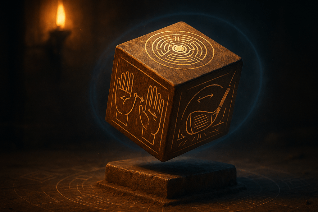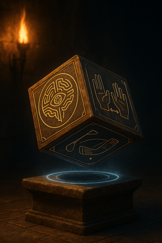 “Photorealistic, cinematic scene in a torch-lit subterranean sanctum. On a stone pedestal sits the Cube of Golf—a hand-crafted maple/bronze relic treated like the Holy Grail. 3/4 hero view. Each of the six faces is inlaid with gold sigils: