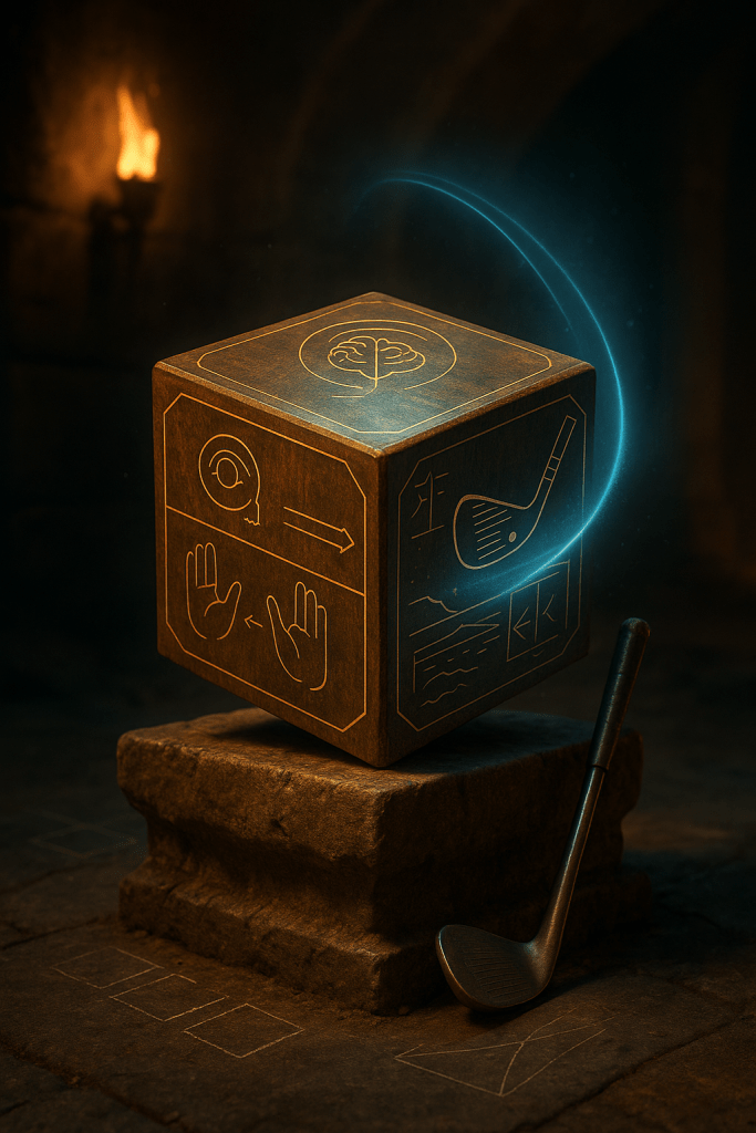 give me an image as if this is a long lost artifact, like the holy grail but it’s a cube and it’s specifically for practicing golf. it unlocks a persons ability to practice (and thus improve) its kind of maybe like hte map and the compass for someone to navigate improving at golf, each side represents a different element, each of which you can manipulate like a science experiment. my specific supermassive session is done in a controlled environment, so i can experience each nuance of what works and what doesn’t, helpful to show up to the same thing the next session the next day. it’s a systematic protocol to guarantee the fastest skill grow, i’m levling up the wedge specifically, mastering the arc and the low point, learning the sole of the clubs and the soul of the clubs. creating a hyper realistic visualization in my mind with what the club and all of taht is doing through the strike zone in particualr. i’m building this skill each session each day, working towards mastering within each session each day, stacking on mastery peaks session after session day after day. and this in turn is also elevating every other club, it’s the pin point spot with the most leverage to get an asymetric return benefiting your entire bag of clubs, to use just wedges like 90% of my practice right now, because i’m doing it daily is out weighing my time at the outdoor range or the golf course.