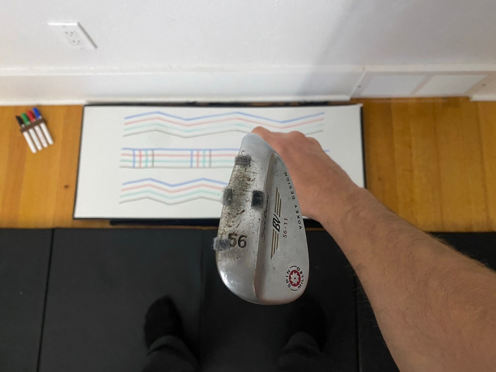 These things Im now stacking into this. Coming back and realizing the whiteboard in office. Allows me to work on stuff that I identified when hitting balls. Makes me more equipped to solve the puzzle hitting balls. When I’m tuned and consistently hitting where I’m aiming on the whiteboard in the office. Without a golf ball. Just getting high feedback practice swings. This is I guess the full deal here. These are practice swings inside. On the whiteboard. I erase the dry erase marker lines. With felt pads on the bottom of the wedge. You see right away if you’re hitting too far being or too far forward. Or too up or down. Etc etc. and then lets you build confidence. So that you can master the practice swing. So that when you step up to hitting a ball. That one practice swing you take. Gets your system calibrated. Super fast. So that you can step up to the ball. And know exactly what’s going to happen. The practice swing is the biggest cheat code in golf. You literally get to do a dry run. Dress rehearsal. If you can use the practice swing effectively. It’s how you can never miss a shot. Gives you the best chance at it. If you can master the practice swing in such a way that you’re fully primed and ready to hit the ball exactly as you imagine.